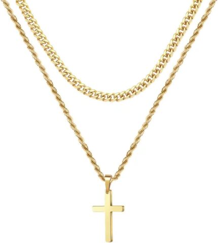 Ursteel Layered Cross Necklace for Men – Stocking Stuffers for Teen Boys, 18K Gold Plated Cross Necklaces Chain for Men Boys Christmas Gifts, Silver Rope Chain Necklace Jewelry 16 18 20 22 24 Inch