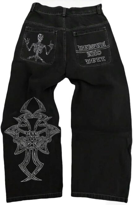 Y2K Beggy Jeans for Women Men Denim Pants Skull Embroidery Gothic Jeans Straight Wide Leg Trouser